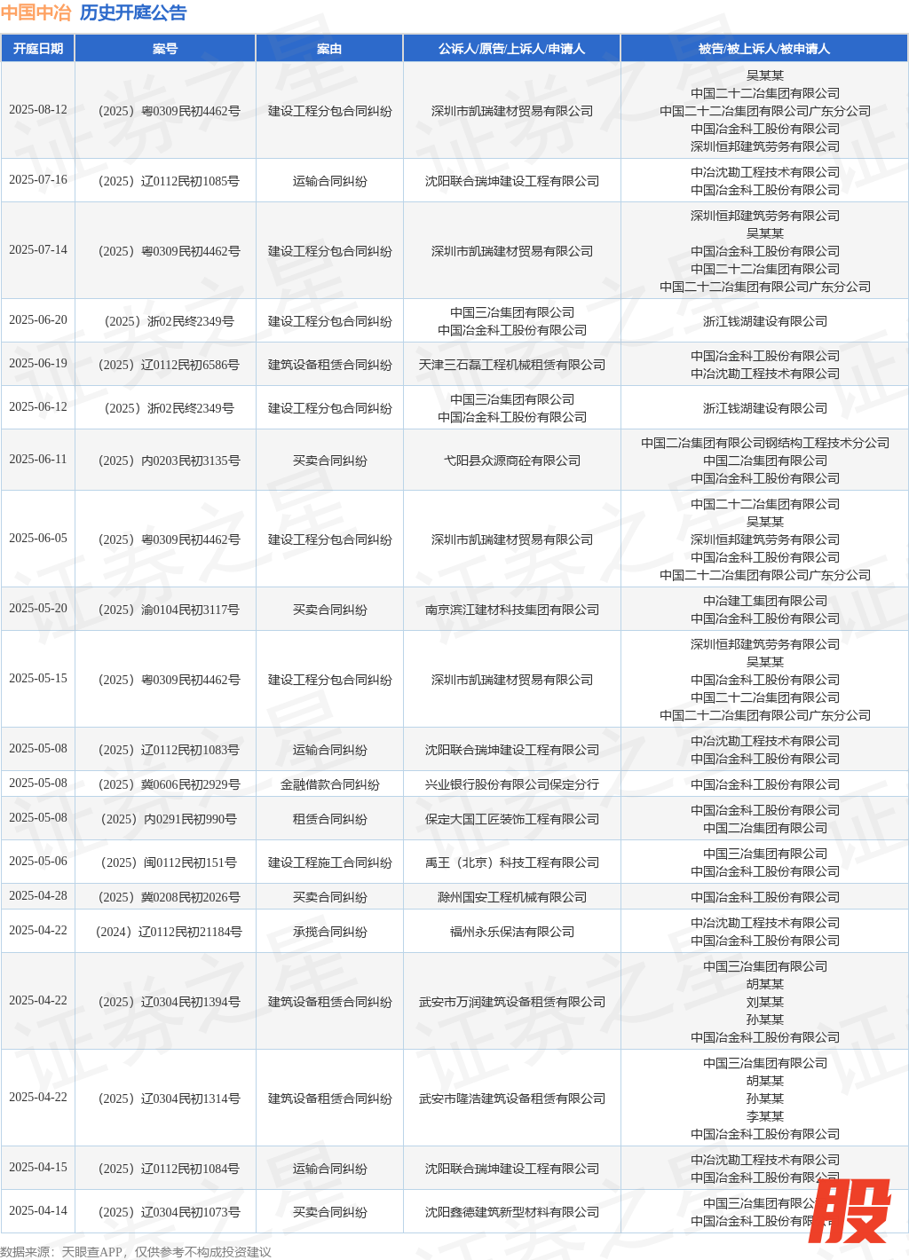 案号:(2025)浙02民终2349号审理法院:浙江省宁波市中级人民法院案由:建设工程分包合同纠纷当事人信息: 原告/上诉人:中国三冶集团有限公司、中国冶金科工股份有限公司 被告/被上诉人:浙江钱湖建设有限公司开庭日期:2025年6月20日根据统计,近一年内以中国冶金科工股份有限公司为当事人的历史开庭公告有77则,其中案由为“买卖合同纠纷”的公告以23则居首,其次为“建设工程分包合同纠纷”有18则,“建设工程施工合同纠纷”有14则。历史开庭公告(前20条)如下: