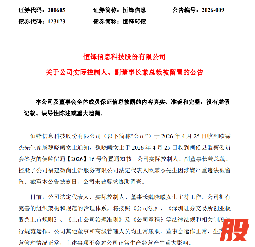 4月26日晚,恒锋信息(300605)发布公告称,公司实际控制人、副董事长兼总裁欧霖杰因涉嫌严重违法,被闽侯县监察委员会留置。